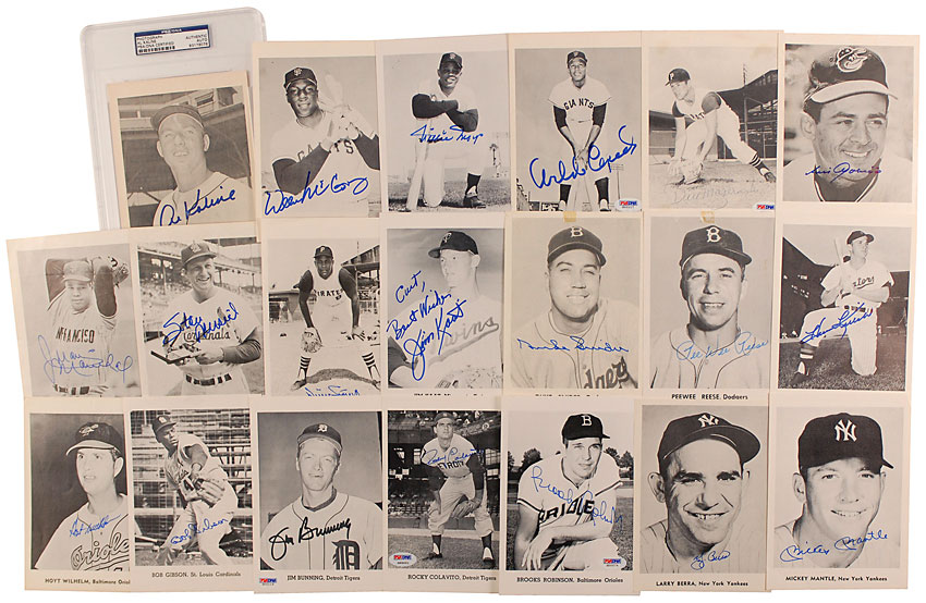 Twenty Jay Publishing or team-issued 5 x 7 photos of Hall of Famers, each signed in felt tip or ballpoint by the respective player pictured. Signers are: Mickey Mantle, Willie Mays, Pee Wee Reese, Stan Musial, Willie Stargell, Yogi Berra, Duke Snider, Rocky Colavito, Bob Gibson, Harmon Killebrew, Willie McCovey, Brooks Robinson, Hoyt Wilhelm, Orlando Cepeda, Juan Marichal, Luis Aparicio, Jim Kaat (ins), Bill Mazeroski, Jim Bunning, and Al Kaline (encapsulated in a plastic PSA/DNA authentication holder). In overall fine condition, with PSA authentication labels affixed to the lower corners of Bunning, Colavito, Robinson, Cepeda, and Mazeroski. Accompanied by certificates of authenticity from PSA/DNA for all with affixed labels. RRAuction COA.