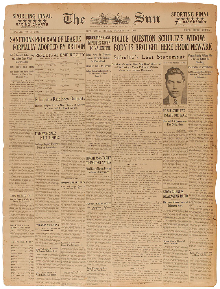 Original October 25, 1935 edition of The New York Sun, 17 x 22.5, 46 pages. Front page bears a headline which reads, "Police Question Schultz's Widow; Body Is Brought Here From Newark," with a small portrait of Luciano stating he is the "object of police search." In very good condition, with edge and corner chips and tears, uniform light toning, and a bit of paper loss to edges. 'Dutch' Schultz had planned on murdering Special Prosecutor Thomas Dewey, with Luciano and his 'Commission' ordering Schultz to drop his plans. When plans were put in motion to kill Dewey, Luciano instead arranged Schultz's murder in a Newark, New Jersey, tavern.