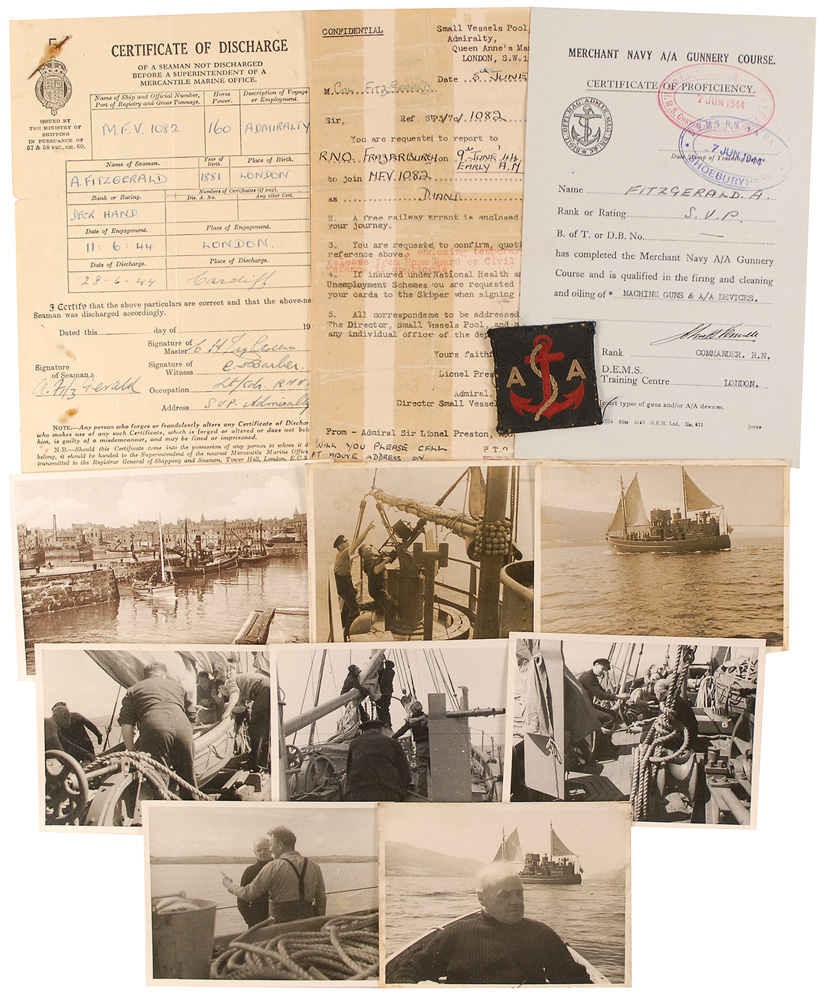 Second mate on board the Titanic (1874–1952), the most senior officer to survive the disaster. Collection of 12 items, with a couple relating to crew member Colonel A. Fitzgerald: a Certificate of Discharge, signed “C. H. Lightoller,” one page, 5.5 x 8, dated June 28, 1944. A discharge issued to deck hand A. Fitzgerald, signed by Lightoller as Master; Fitzgerald’s June 5, 1944, confidential orders listing Lightoller as skipper; Fitzgerald’s certificate of proficiency for a gunnery; a small patch from his uniform; a postcard from Fitzgerald, dated June 11, 1944, mentioning his armed vessel will be heading to Loch Ness and “hope to have a view of the Loch Ness Monster”; and seven original 4.25 x 3.25 unpublished candid photos of the crew and vessel, including one picturing Lightoller, patrolling Loch Ness. In overall very good condition. Forever dogged by his time on the Titanic, Lightoller retired in the 1930s. However, he used his own boat to help rescue soldiers during the Dunkirk evacuation.