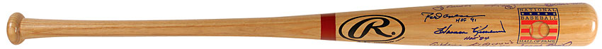 Official Rawlings Hall of Fame logo baseball bat signed in-person in blue felt tip by 15 American League Hall of Famers. Signers are: Carl Yastrzemski, Robin Yount, George Brett, Cal Ripken, Jr., Yogi Berra, Reggie Jackson, Carlton Fisk, Eddie Murray, Frank Robinson, Brooks Robinson, Harmon Killebrew, Al Kaline, Luis Aparicio, Rod Carew, and Paul Molitor. In fine condition. Pre-certified Steve Grad/PSA/DNA and RR Auction COA.
