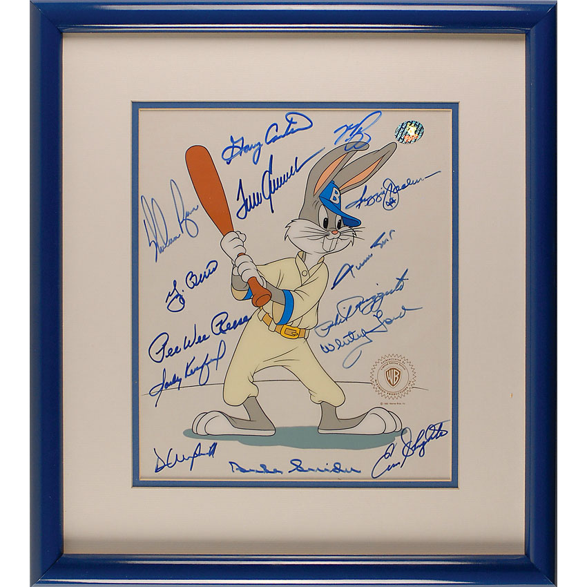 Color limited edition 10.5 x 12.5 Warner Brothers sericel of Bugs Bunny at bat, signed in-person in blue felt tip by 14 baseball greats. Signers are: Willie Mays, Sandy Koufax, Pee Wee Reese, Duke Snider, Tom Seaver, Nolan Ryan, Gary Carter, Reggie Jackson, Yogi Berra, Phil Rizzuto, Whitey Ford, Dave Winfield, Enos Slaughter, and future Hall of Famer Mike Piazza. Attractively double matted and framed to an overall size of 18 x 20. In fine condition. Pre-certified Steve Grad/PSA/DNA and RR Auction COA.