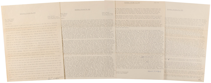 Thief, bankrobber, kidnapper, and bootlegger (1907–1979) nicknamed ‘The Rat’ by J. Edgar Hoover. Collection of six items consisting of three TLSs, two signed “Alvin Karpis,” and one signed “Al,” two one-page and one two-page, dated from October and November of 1969, all three to noted bank robber Frank Sawyer, shortly after Sawyer’s release from prison for a robbery he didn’t commit. One letter reads, in part: “It would be easy to just disappear but that would solve nothing for you. Perhaps that D. A. was hoping that you would hit the panic button and go on the lam, he then would be able to say; ‘See, I told you so.’ Frank, play it cool, you have made it now and there is no reason for you to ever get in trouble again. I am sure that your attorneys will see to it that you wind up with enough to keep you comfortable from here on out.” Another letter, dated November 27, reads, in part: “You can rest assured that Mr. Belli will see to it that you are not put back in prison. He will make them all look just like the dirty bastards they are, the D. A. and the judge that went along with old senile bastard in this…Frank, you will wind up the winner all the way around by the time it is all over with. As a matter of fact this petty persecution will work out in your favor if you play it cool and do not attempt to lam. You have nothing to run away from but those bastards do. They are going to outsmart themselves and Belli will wind up picking up all the marbles.” Karpis also discusses the difficulty in adjusting to life outside of prison, a television appearance he made, and about Sawyer’s potential relocation to Canada or Mexico. Also included are three glossy photos of Karpis arriving in Canada after his deportation, two 8.25 x 6 and one 6 x 8.25, each signed and inscribed in silver ink to Sawyer from Karpis. In fine condition, with scattered mild toning to letters. Sawyer was imprisoned for over two decades for the 1933 Fort Scott robbery. He was finally pardoned in September of 1969 after a signed statement from Karpis cleared Sawyer’s name.