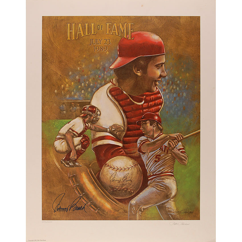 Color limited edition 17.5 x 22 print honoring Bench’s selection to the Hall of Fame, numbered #373/1000, signed in blue felt tip. Also signed in pencil by the artist, Pati Pierce. In fine condition, with a bit of scattered light soiling to borders. Pre-certified Steve Grad/PSA/DNA and RR Auction COA.