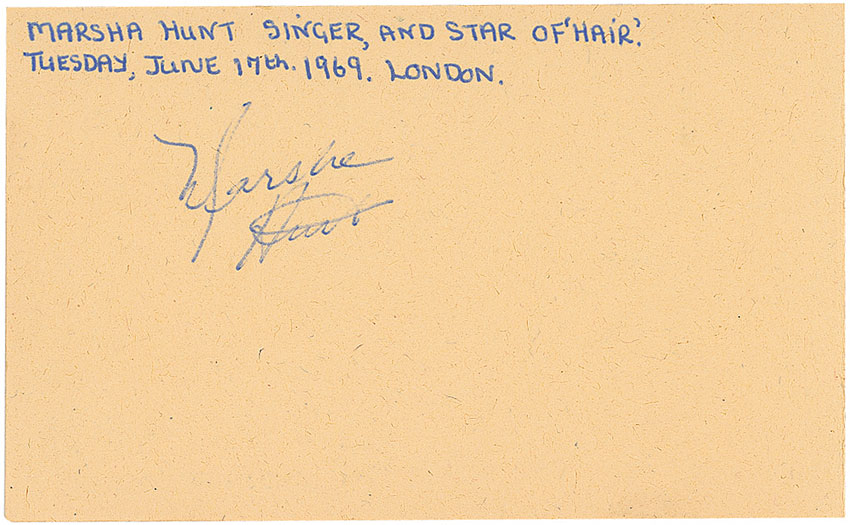 Singer and actress who had a 10-month affair with Mick Jagger, and who the Stones song ‘Brown Sugar’ is about. Vintage ballpoint signature, “Marsha Hunt,” on an off-white 4.75 x 3 album page with a collector’s notation along top edge. In fine condition. Accompanied by a letter of provenance from the original recipient stating the signature was acquired in June of 1969 at the Beatles Apple office. RRAuction COA.