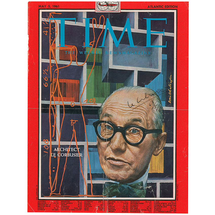 Important architect, artist, and industrial designer (1887–1965) whose central role in the development of the International Style made him one of the most influential and widely debated figures in the history of architecture. Magazine cover from the May 5, 1961, issue of Time magazine, 8.25 x 11, featuring an image of Le Corbusier among some of his works, signed in black ink, “Le Corbusier 11/5/61.” In very good condition, with central vertical and horizontal folds, and moderate scattered creasing and wrinkling. Accompanied by the original mailing envelope. RRAuction COA.