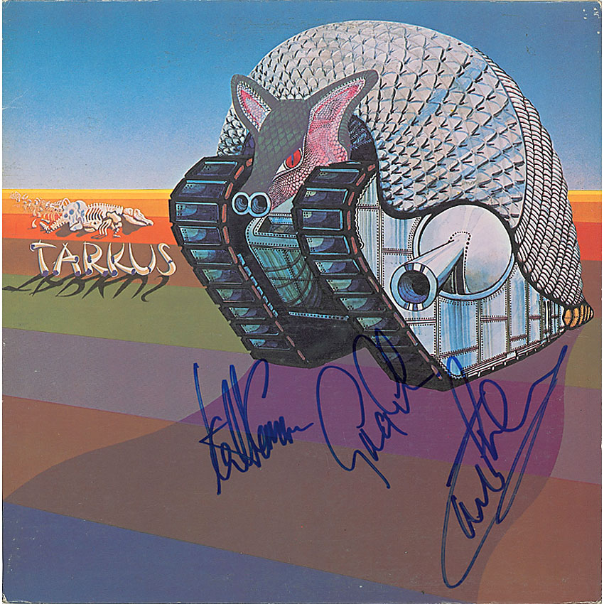 Tarkus album signed on the front cover in blue felt tip by Keith Emerson, Greg Lake, and Carl Palmer. In fine condition, with some scattered mild cover wear. The record is included. Pre-certified Roger Epperson/REAL and RR Auction COA.