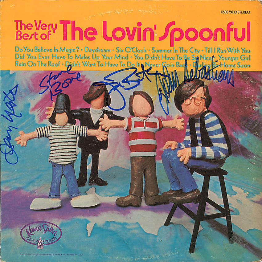 The Very Best of The Lovin’ Spoonful album signed on the front cover in blue felt tip by John Sebastian, Steve Boone, Joe Butler, and Jerry Yester. Scattered cover and edge wear and a mild ‘ring of wear’ to cover, otherwise fine condition. The record is not included. RRAuction COA.