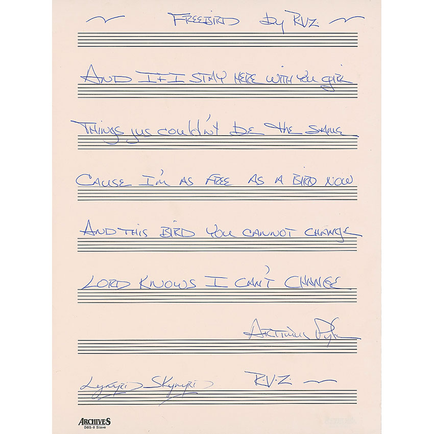 Souvenir handwritten lyrics to part of the second verse of “Freebird” on a white 9.5 x 12.5 sheet of musical manuscript paper, signed “Artimus Pyle, Lynyrd Skynyrd RVZ.” In part: “And if I stay here with you girl, things just couldn’t be the same, cause I’m as free as a bird now, And this bird you cannot change.” In very fine condition. Pre-certified Roger Epperson/REAL and RR Auction COA.
