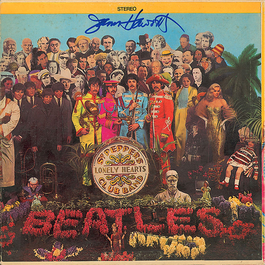 American pop artist who, aside for her pioneering work in soft sculpture, is cemented in music history as the co-creator of the Beatles’ Sgt. Pepper’s Lonely Hearts Club Band album cover. Sgt. Pepper’s Lonely Hearts Club Band album signed on the front cover in blue felt tip by Haworth. In fine condition, with scattered light foxing and impressions to covers, as well as some light rubbing. The record is not included. RRAuction COA.
