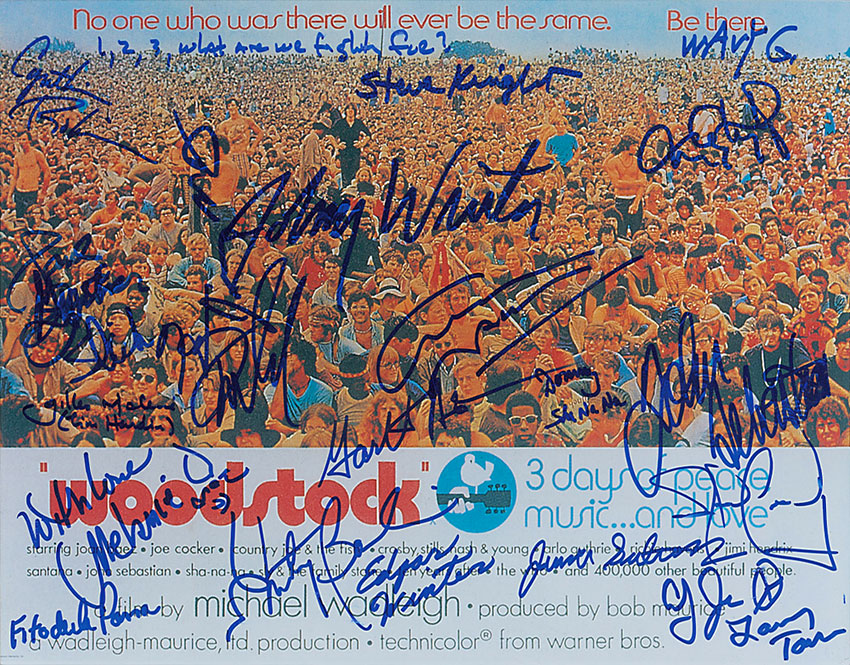 Color glossy 14 x 11 photo of a Woodstock film poster, signed in blue felt tip by 22 performers: Graham Nash, Grace Slick, Paul Kantner, Jack Casady, Garth Hudson, Johnny Winter, Edgar Winter, Country Joe McDonald, Donny York, Melanie, Marty Balin, Larry Taylor, Fito de la Parra, Harvey Mandel, Steve Knight, Juma Sultan, John Sebastian, Cynthia Robinson, Jerry Martini, Tom Constanten, Wavy Gravy, and Gilles Malkine. In fine condition. RRAuction COA.