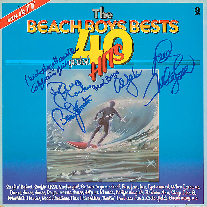 Beach Boys Bests 40 Greatest Hits album signed on the front cover in blue felt tip by Mike Love, Brian Johnston, Al Jardine, and David Marks, adding “I wish they all could be California girls.” In fine condition, with a bit of scattered light cover wear. The record is not included. Pre-certified Roger Epperson/REAL and RR Auction COA.