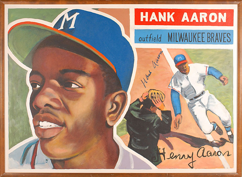 Enormous original oil painting on canvas of Aaron’s 1956 Topps baseball card, 26 x 36, signed in blue paint pen by Aaron. In fine condition. Pre-certified Steve Grad/PSA/DNA and RR Auction COA.