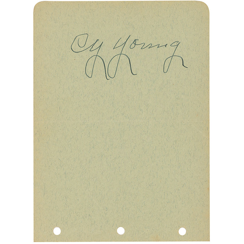 Vintage fountain pen signature, “Cy Young,” on a light green 4.25 x 6 album page. In fine condition, with a central horizontal fold and a couple light wrinkles, none of which affect the signature. Pre-certified Steve Grad/PSA/DNA and RR Auction COA.