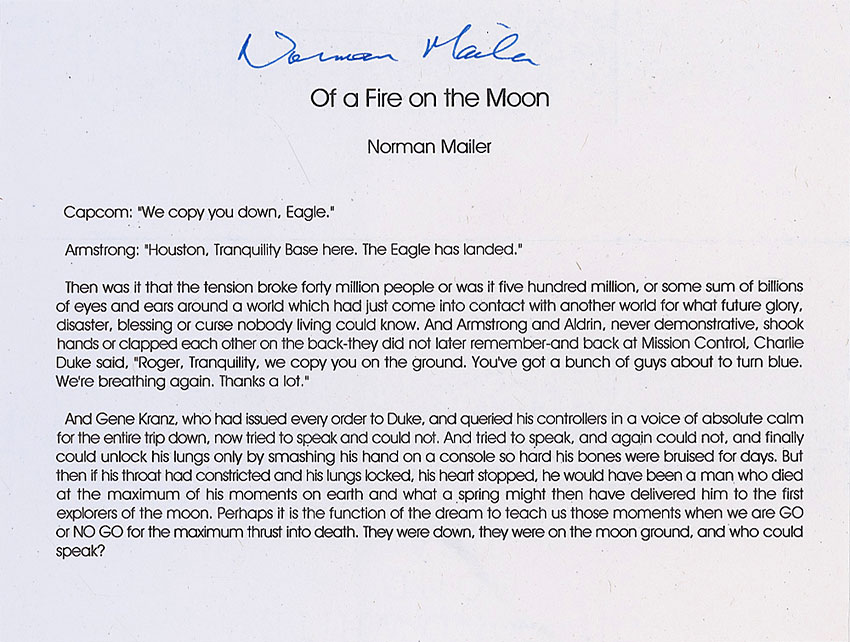 Souvenir TQS signed “Norman Mailer,” one page, 7.5 x 5.75, from ‘Of a Fire on the Moon,’ Mailer’s reactions to the lunar landing. In part: “Then was it that the tension broke forty million people or was it five hundred million, or some sum of billions of eyes and ears around a world which had just come into contact with another world for what future glory, disaster, blessing or curse nobody living could know.” In fine condition, with one horizontal fold through the text. RRAuction COA.