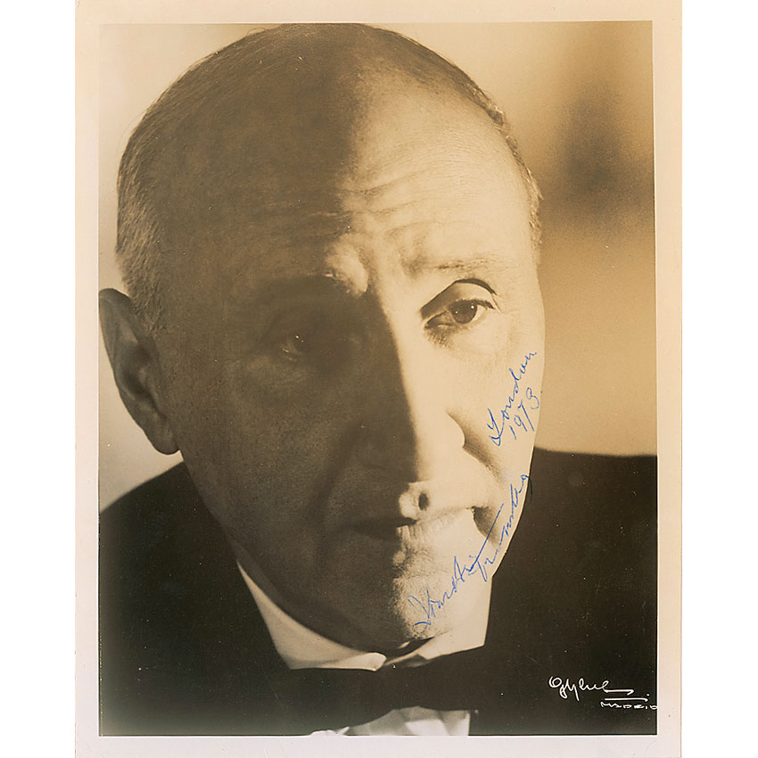 Composer (1894–1979) of over 140 film scores, including High Noon, Giant, The Old Man and the Sea, and The Guns of Navarone. Over his career, Tiomkin received 22 Academy Award nominations and won four Oscars. Pearl-finish 8 x 10 portrait, signed in blue ballpoint, “Dmitri Tiomkin, London 1973.” Creases to the corner tips, a few scattered marks and impressions, and some skipping to the signature, otherwise fine condition. RRAuction COA.
