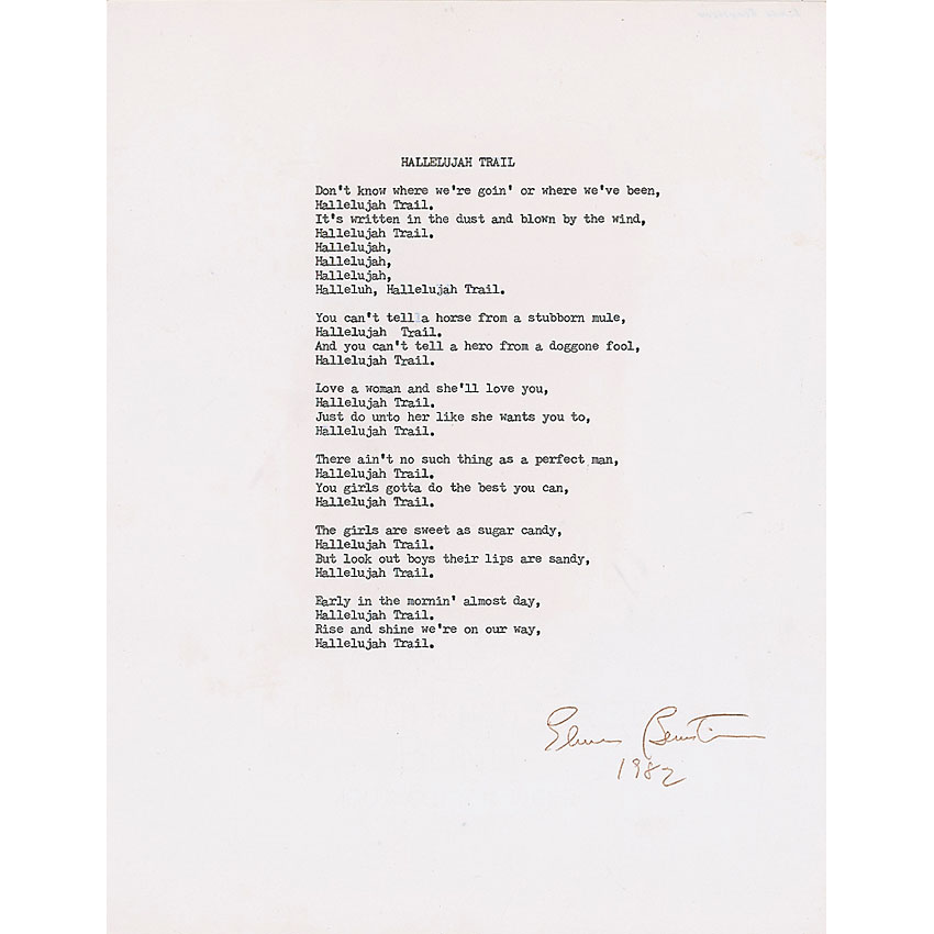 Souvenir printed lyrics to ‘Hallelujah Trail’ on a white 8.5 x 11 sheet, signed in black ballpoint, “Elmer Bernstein 1982.” In fine condition, with a few mild scattered creases and the signature a shade light. RRAuction COA.