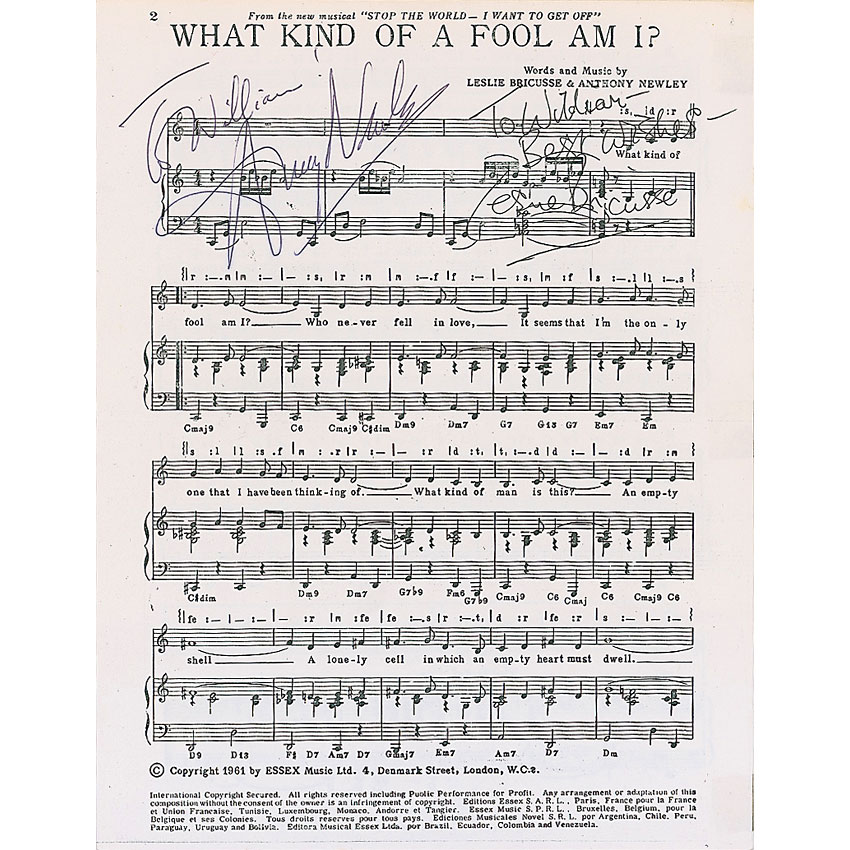 Sheet music to ‘What Kind of Fool Am I?,’ two pages, 8.5 x 11, signed and inscribed on the first page in ballpoint and ink, “To William, Anthony Newley,” and “To William—Best wishes—Leslie Bricusse.” In fine condition, with light scattered creases and a central horizontal fold. RRAuction COA.