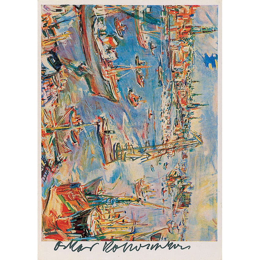 Postcard featuring Kokoschka’s ‘Harbor of Hamburg,’ 5.75 x 4, signed vertically in black felt tip. In fine condition, with light corner tip creasing. RRAuction COA.