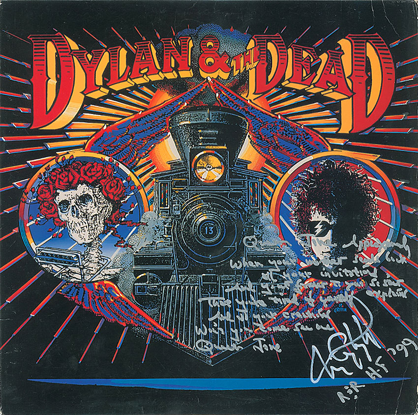 Dylan & The Dead album signed on the front cover in silver ink by Constanten, adding the lyrics to the first verse of ‘Queen Jane Approximately.’ In fine condition, with some light corner creases. The record is included. Pre-certified Roger Epperson/REAL and RR Auction COA.
