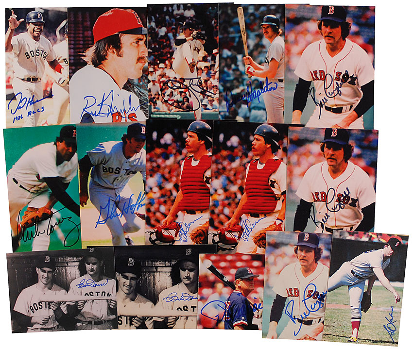 Fifteen photos ranging in size from 3.25 x 3.5 to 4 x 6, various finishes, each signed by the respective Red Sox player or manager pictured. Signers are: Bobby Doerr (2), Dave Henderson, Jimy Williams, Mike Torrez, Skip Lockwood, Bill Campbell (3), Glenn Hoffman, Gary Allenson (2), Dave Stapleton, John Tudor, and Rick Miller. In fine condition. RRAuction COA.