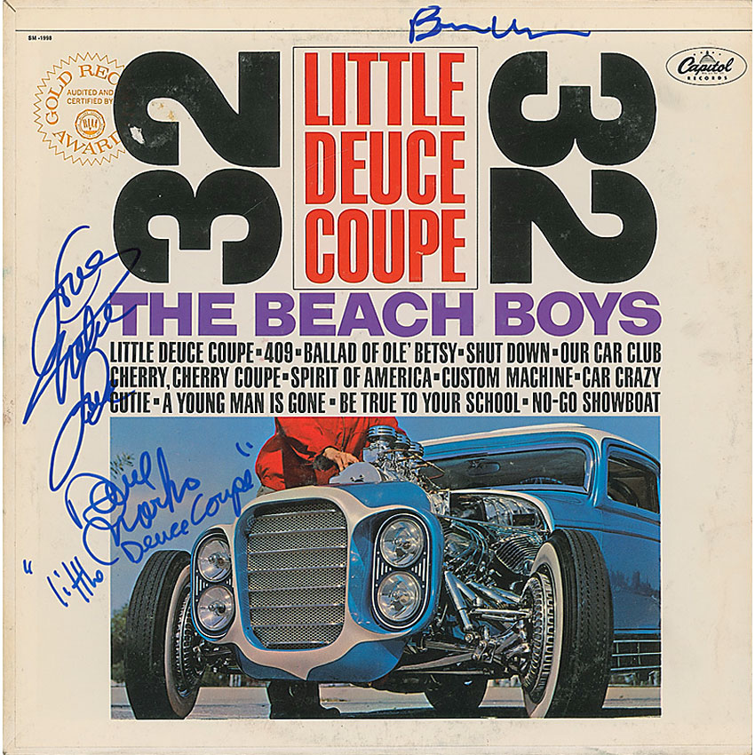 Little Deuce Coupe album signed on the front in blue felt tip, “Brian Wilson,” “Love, Mike Love,” and “David Marks, ‘Little Deuce Coupe.’” In fine condition, with scattered light soiling, a mild ‘ring of wear,’ and a few dings to the spine. The record is included. Pre-certified Roger Epperson/REAL and RR Auction COA.