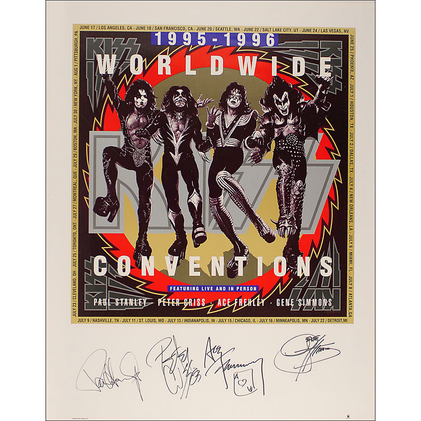 Color 26 x 33 promotional poster for the 1995-1996 Worldwide Conventions, signed in the lower border in black felt tip by Paul Stanley, Gene Simmons, Peter Criss, and Ace Frehley, adding his small card sketch. Rolled and in fine condition, with a couple light corner and border creases, and a slight brush to Simmons’s signature. Pre-certified Roger Epperson/REAL and RR Auction COA.