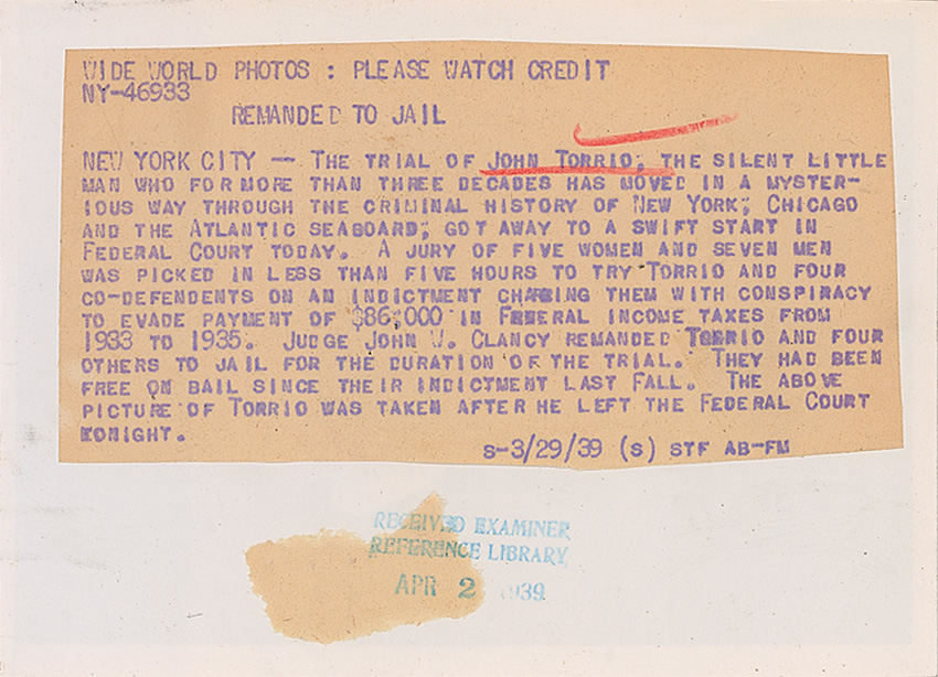 Vintage original 1939 5 x 7 inches gelatin silver photograph of Mobster John Torrio leaving the federal court house in New York during his trial. Nice clean image with Torrio looking straight at the camera. The back has an original World Wide Photos caption sheet and a San Francisco Examiner stamp dated 1939. Originates from the Examiner's archives. Mild rippling, otherwise fine condition.