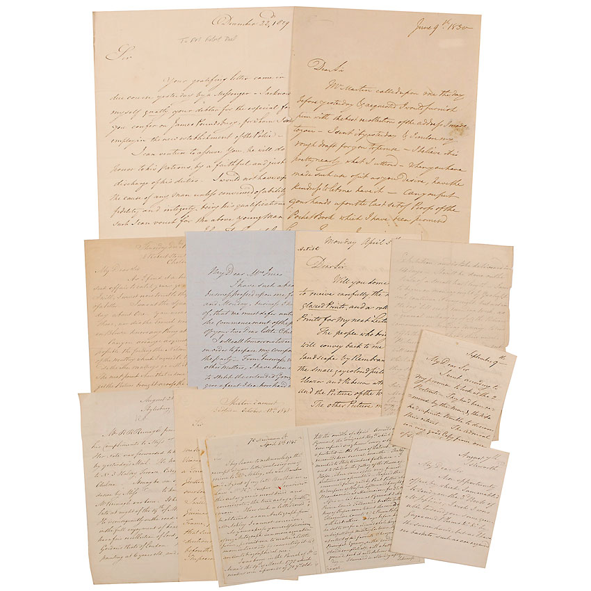 English portrait, landscape, and animal painter (1775–1862) who was a royal academician and president of the Society of Painters in Watercolours. Eleven ALSs, nine signed “R. R. Reinagle,” one signed “R. R. R.,” and one signed “Baron Reinagle,” total of 30 pages, various sizes from 3.5 x 4.5 to 7.5 x 9, dated between 1829 and 1850. Reinagle writes on a variety of topics, including a painting by Rembrandt, a lengthy autobiography, cleaning a copy of a Sir Joshua Reynolds painting, the sale of a painting for 100 guineas, painting during daylight hours versus at night by gaslight, a gallery exhibition, and a letter to future Prime Minister Robert Peel regarding a police force hire. In overall very good to fine condition, with light toning, slight separation to mailing folds, and a few small tears (some professionally repaired). RRAuction COA.