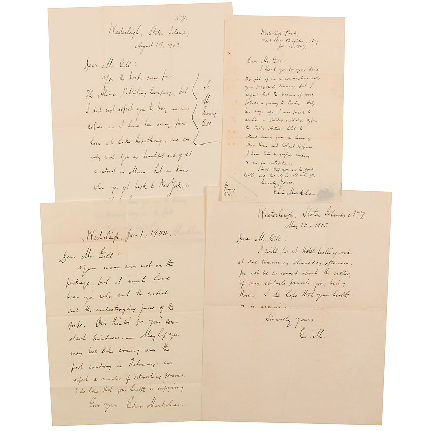 Four ALSs, three signed “Edwin Markham” and one signed with his initials, various sizes from 5.5 x 8.5 to 8.5 x 11, dated 1903–07, mostly regarding plans and travels. In very good to fine condition, with intersecting folds to three and scattered foxing to one. Accompanied by one original mailing envelope and one panel, both filled out by Markham with his signature in the return address area. RRAuction COA.