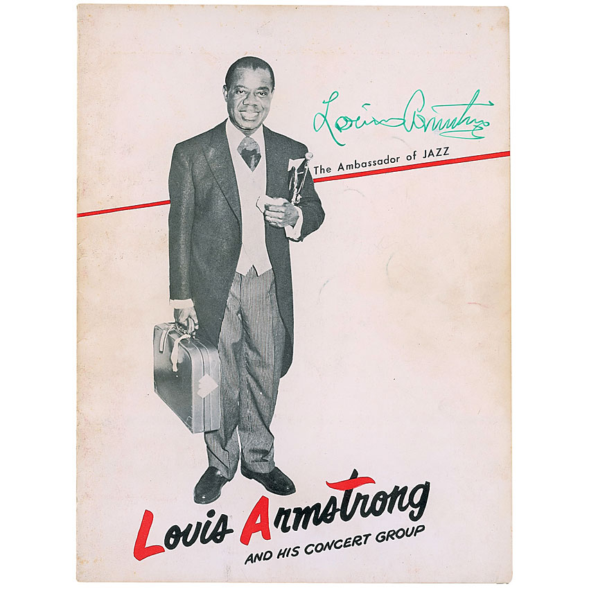 Program for Louis Armstrong and his concert group, 9 x 12, signed in green ink on the front cover by Armstrong. The following members of his band have also signed inside: Velma Middleton, Trummy Young, Billy Kyle, Mort Herbert, Danny Barcelona, and Edmond Hall. Scattered creases, toning, and soiling to the front and back covers, otherwise fine condition. RRAuction COA.