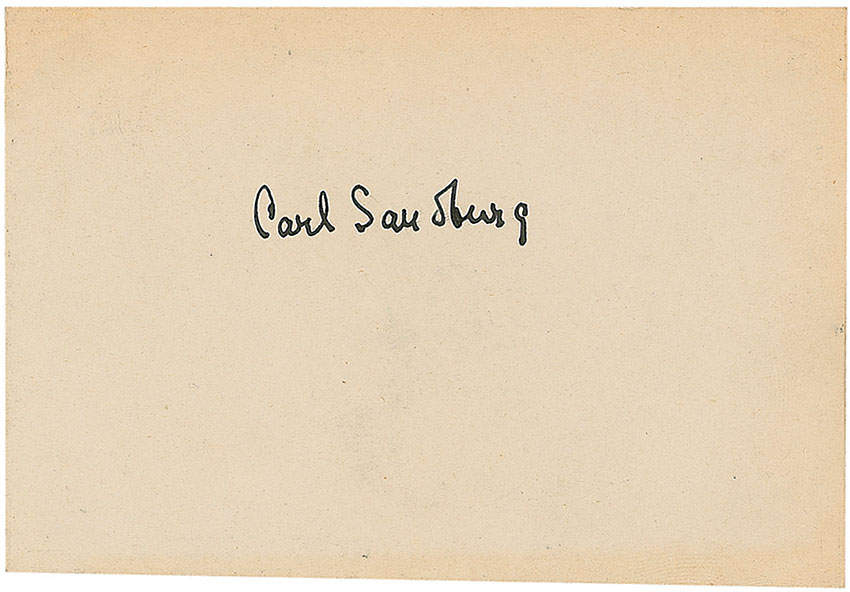 Vintage ink signature, “Carl Sandburg,” on an off-white 4.5 x 3 card. In fine condition, with a mild shade of toning. RRAuction COA.