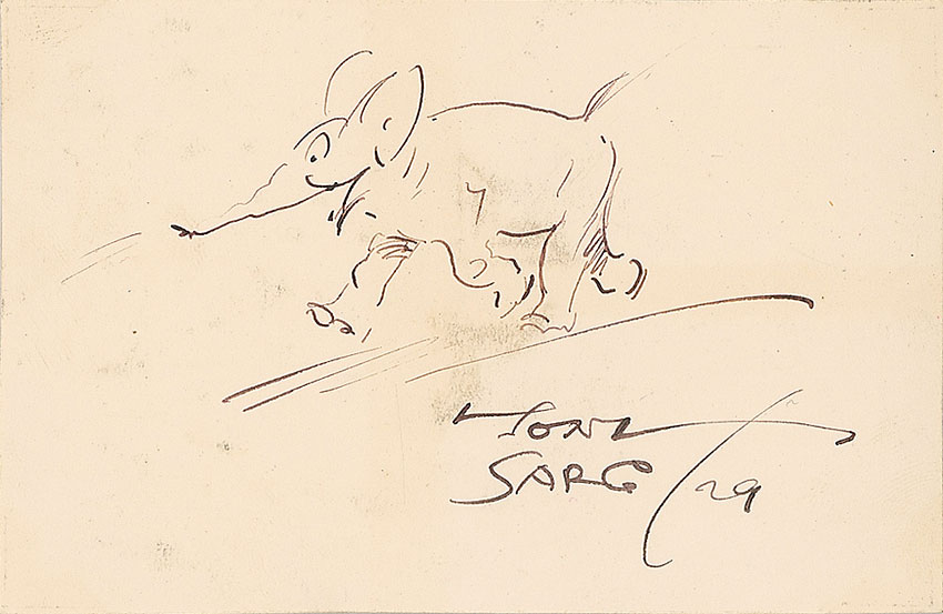 Original vintage ink sketch of a running elephant on an off-white 4 x 2.5 card, signed “Tony Sarg 29.” In fine condition, with some light scattered soiling. RRAuction COA.