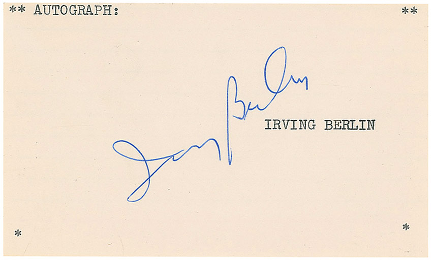 Ballpoint signature, “Irving Berlin,” on an off-white 5 x 3 card with typed notations. In fine condition. RRAuction COA.