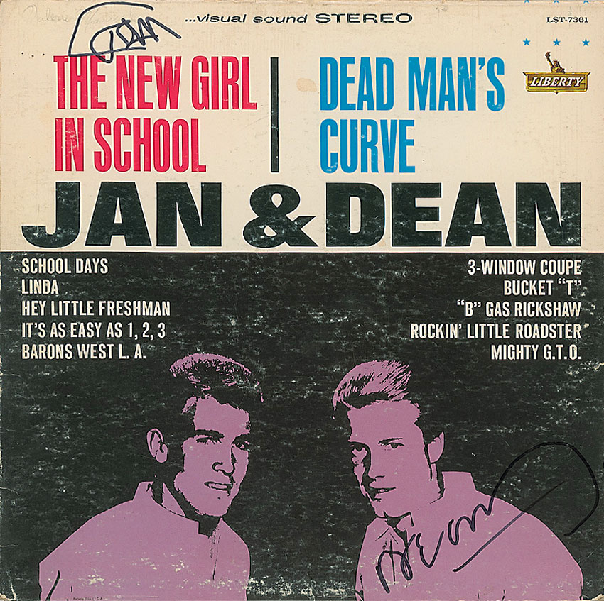 Dead Man’s Curve/The New Girl in School album signed on the front cover in black felt tip, “Jan” and “Dean.” Scattered rubbing wear and surface marks to cover, a bit of soiling to cover, and a small pencil notation to top left under Jan’s signature, otherwise fine condition. The record is included. RRAuction COA.
