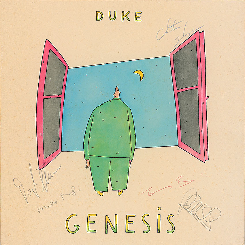 Duke album flat signed in ballpoint by Phil Collins, Mike Rutherford, Tony Banks, Chester Thompson, and Daryl Stuermer. In fine condition, with light scattered foxing and a couple mild creases. Accompanied by the full album with the record included. Pre-certified Roger Epperson/REAL and RR Auction COA.