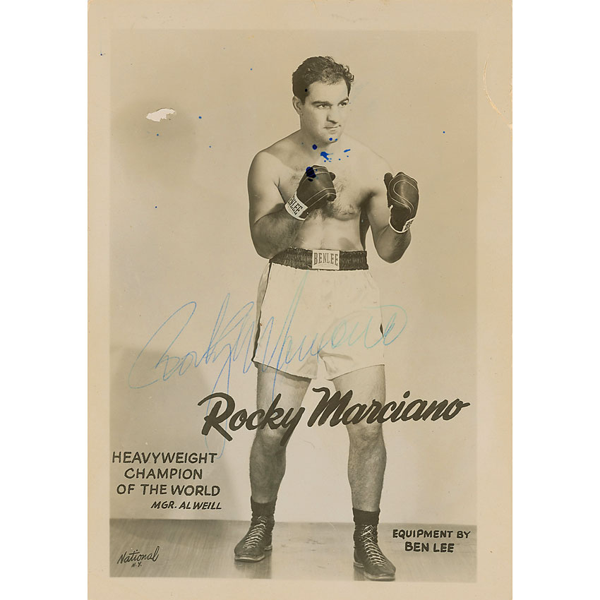 Vintage glossy 5 x 7 Ben Lee promotional photo, signed in blue ballpoint. In very good condition, with scattered creases, a spot of emulsion loss to the upper left, a few stray ink spots (heaviest to Marciano’s chin and neck), and the end of the signature a shade light. Pre-certified Steve Grad/PSA/DNA and RR Auction COA.