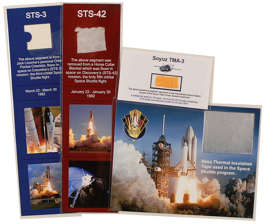 Collection of three relics from the Shuttle program: a clipped segment of Jack Lousma’s personal orbit checklist flown on Columbia’s STS-3 mission; a flown segment of a horse collar blanket flown on Discovery’s STS-42 mission; and a square section of thermal insulation tape. Also included is a small swatch of parachute material from Soyuz TMA-3’s descent parachute. Each relic is affixed to a various sized informational card. RRAuction COA.