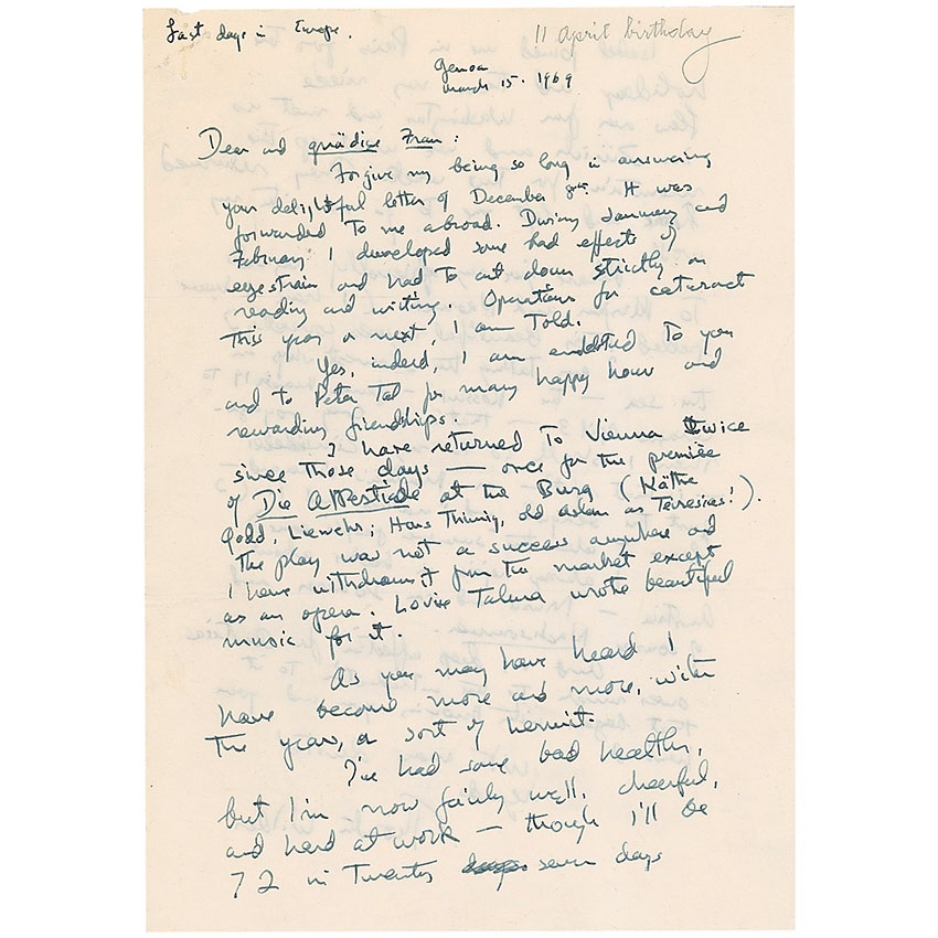 ALS, one page both sides, 5.75 x 8.25, March 15, 1969. Letter to a friend. In part: “Forgive my being so long in answering your delightful letter…During January and February I developed some bad effects of eye strain and had to cut down strictly on reading and writing. Operations for cataract this year or next, I am told…I have returned to Vienna twice…once for the premier of Die Alcestiad at the Burg…The play was not a success anywhere and I have withdrawn it from the market except as an opera. Louise Talma wrote beautiful music for it. As you may have heard I have become more and more, with the years, a sort of hermit. I’ve had some bad health, but now I’m fairly well, cheerful, and hard at work.” Staple holes to the upper left corner, light scattered creases, and a pencil notation to the top, otherwise fine condition. Accompanied by a carbon copy of the initial two-page letter, with the return address panel from the original mailing envelope affixed, partially filled out in Wilder’s hand. RRAuction COA.
