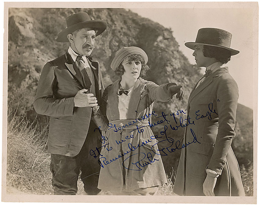 Two vintage glossy 10 x 8 photos: one of Roland in White Eagle, signed and inscribed in fountain pen, “To Genevieve, a regular ‘movie fan,’ I’m glad there are still some left. Best wishes, Ruth Roland”; and one of Roland in The Avenging Arrow, signed and inscribed in fountain pen, “To Genevieve, It is nice to meet you. Remembrance of ‘White Eagle,’ Ruth Roland.” In very good condition, with scattered creases to both, and a tear to the top edge and paper loss to the lower corners of the White Eagle photo. RRAuction COA.