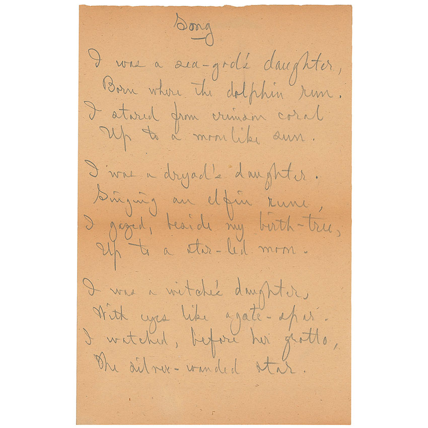 California poet (1869–1926) who Ambrose Bierce compared to Coleridge, Keats, and Poe yet remained relatively unknown outside of his home state. He committed suicide by poisoning himself with cyanide on November 17, 1926. Handwritten poem in pencil, signed “George Sterling,” on two 6 x 9 sheets, dated August 27, 1922. Sterling writes out his poem entitled ‘Song.’ In full: “I was a sea-god's daughter,/ Born where the dolphin run./ I stared from crimson coral/ Up to a moonlike sun./ I was a dryad's daughter./ Singing an elfin rune,/ I gazed, beside my birth-tree,/ Up to a star-led moon./ I was a witch's daughter,/ With eyes like agate-spar./ I watched, before her grotto,/ The silver-wanded star./ I am a cobbler's daughter,/ Tired ere my toil is done./ I looked through broken windows/ On star and moon and sun.” In fine condition, with central horizontal folds and a moderate uniform shade of toning. RRAuction COA.
