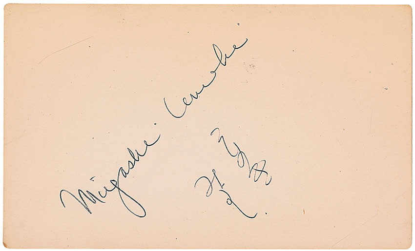 Japanese-born actress (1929–2007) best known for her Oscar-winning turn in Sayonara and for her role as Mrs. Livingston in the television series The Courtship of Eddie’s Father. Ballpoint signature, “Miyoshi Umeki,” on an off-white 5 x 3 card, adding two Japanese characters underneath. In fine condition, with a light uniform shade of toning. Pre-certified PSA/DNA and RR Auction COA.