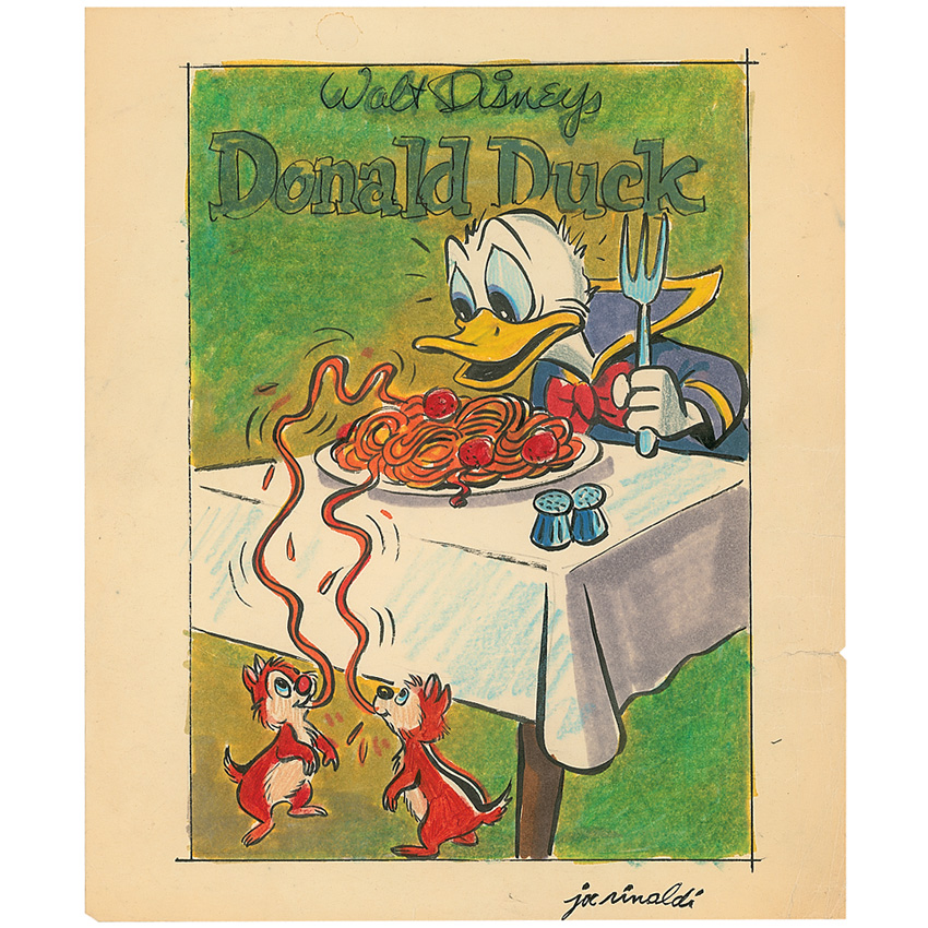 Original ink, watercolor, and colored pencil artwork of Donald Duck ready to eat a plate of spaghetti on a 10 x 12 off-white sheet, signed in the lower border in black ink. In very good condition, with scattered creases, a light overall shade of toning, and a few tears to the borders that could be matted out. RRAuction COA.