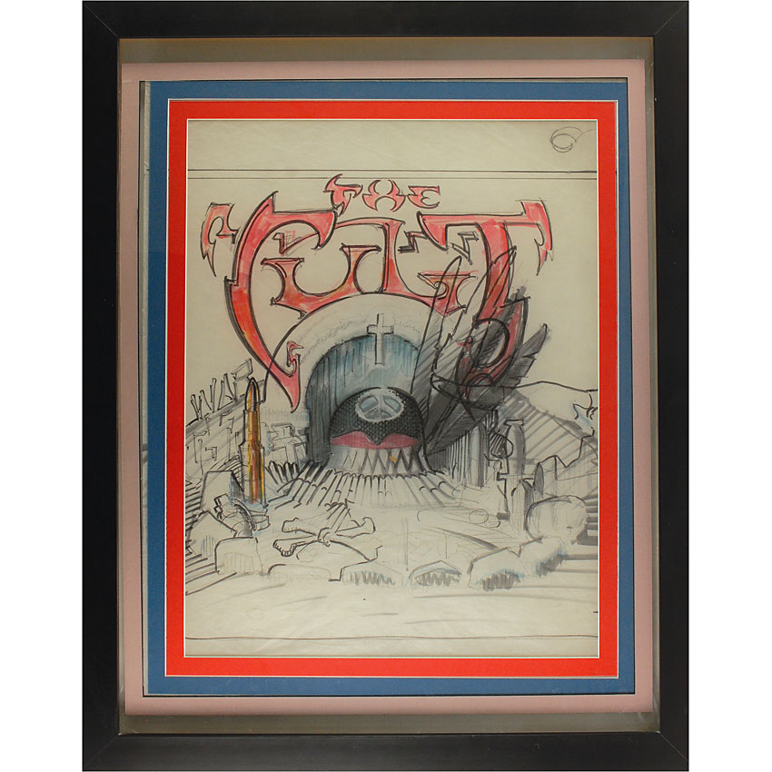 Original unsigned colored felt tip and pencil conceptual album artwork, originally intended for the band’s ‘Soldier Blue’ single in 1987, done by noted artist Rick Griffin, 19 x 21. When the planned release for the single was abandoned, the artwork was unused. It was then adapted for use as the cover for The Best of Rare Cult. Double matted and framed to an overall size of 23.5 x 29.75. In fine condition, with a couple of light diagonal creases. Oversized. RRAuction COA.