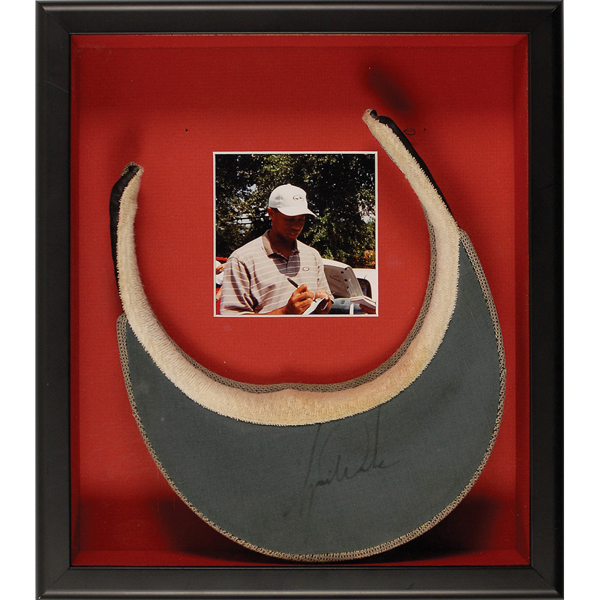 Gray California Golf and Fish Club visor, signed on the brim in black felt tip. Displayed in a 12 x 13.5 shadowbox. In fine condition, with some light contrast to the signature and some staining to sweatband. Accompanied by four photos of the event at which the original collector met Woods. Pre-certified Steve Grad/PSA/DNA and RR Auction COA.