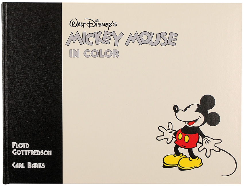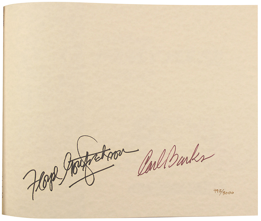 Signed book: Walt Disney’s Mickey Mouse in Color. Limited edition 3000 copies (this being No. 992). Prescott, Arizona: Another Rainbow Publishing, Inc., 1988. Hardcover with dustjacket, 16.75 x 12.75, 248 pages. Signed on a special limitations page by Carl Barks and Floyd Gottfredson. The audio disc is included. A great volume filled with wonderful color images and great rarities. RRAuction COA.