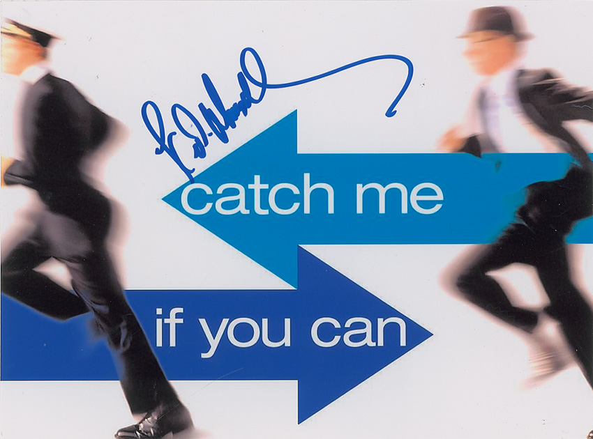 Color glossy 10.75 x 8 publicity photo for Catch Me If You Can, signed in blue felt tip. In fine condition, with a Frank W. Abagnale pressed seal to lower right. RRAuction COA.