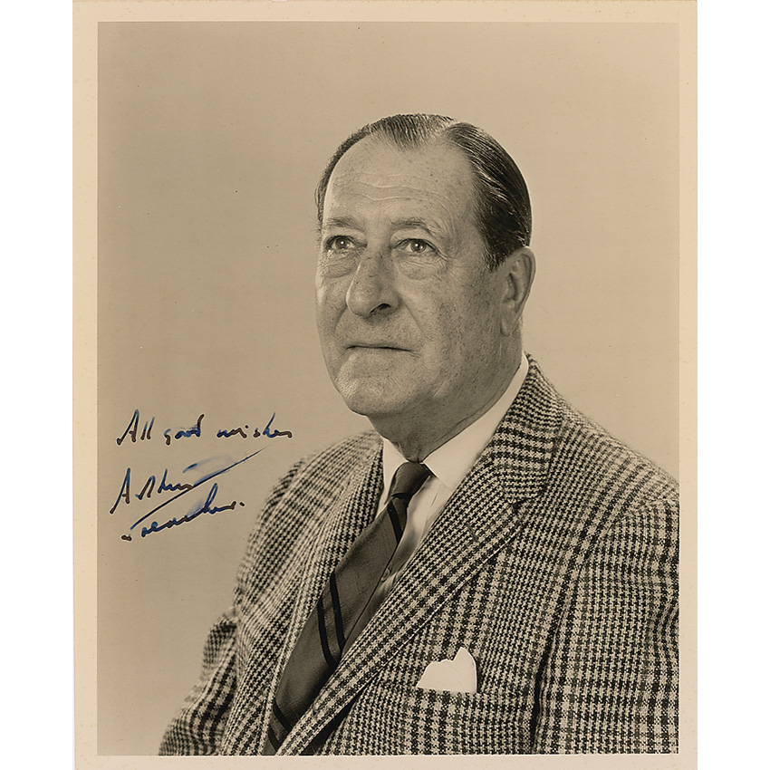 Vintage glossy 8 x 10 head-and-shoulders photo, signed in fountain pen, “All good wishes, Arthur Treacher.” A couple light creases and moderate brushing to the signature, otherwise fine condition. Pre-certified PSA/DNA and RR Auction COA.