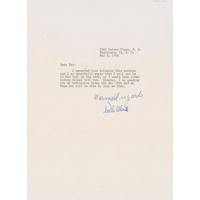Socialite and political hostess (1889–1975) known for throwing lavish parties. TLS, one page, 8.5 x 11, May 8, 1964. A dinner invitation. In full: “I received your telegram this morning and I am dreadfully sorry that I will not be in New York on the 14th, as I would have loved having dinner with you. However, I am sending you an invitation today for May 18th and do hope you will be able to join me then.” In fine condition. RRAuction COA.