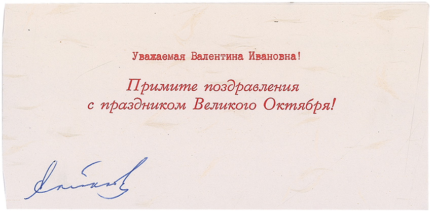 Appointed KGB chief in 1967, he became a full member of the Politburo in 1973. His firm handling of dissident movements enhanced his reputation, enabling him to be chosen as Brezhnev's successor in 1983, but he died after less than 15 months in office. Printed greeting card with a message in Russian, 7.5 x 3.75, signed at the bottom in blue ballpoint. In fine condition. RRAuction COA.
