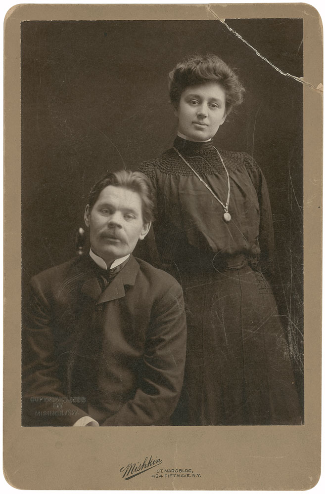 Original early 1900s cabinet card photograph, 4.25 x 6.75, of Russian author Maxim Gorky and his wife by Herman Mishkin, official portraitist of New York’s Metropolitan Opera. The studio image was shot in the United States while Gorky was on tour. The image quality is exceptional, with great detail and deep tones. The front of the cabinet has the Mishkin Studio imprint and 1906 copyright. The upper left corner is heavily creased with reinforcement tape on back. The back also has a handwritten ink caption for the image. Despite the wear, an exceptional original portrait of the couple. Mishkin was born in Minsk Russia and immigrated to the United States where he became a prominent photographer of New York’s art scene. RR Auction COA.